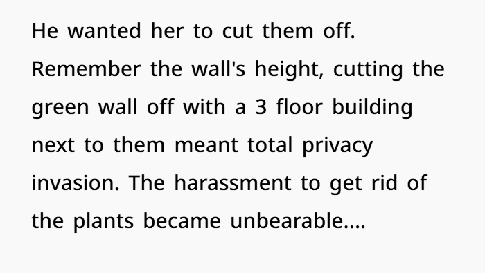 But when the house next door was sold and a new neighbor moved in — along with a towering, unauthorized 3-floor apartment complex — things changed. Suddenly, the same plants he once praised were “a nuisance,” and he demanded they be removed. So she did. But not in the way he expected. With full municipal permission, she replaced the greenery with a towering wall of concrete. And then? She regrew the plants anyway — now fully on her terms.