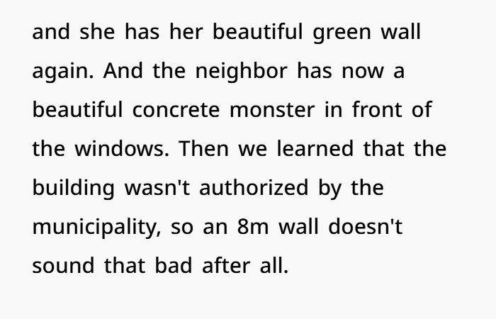 She got city permits, hired an architect, and built an 8-meter-high wall. Legal. Permanent. Fully within her rights. Concrete. Impenetrable. Unapologetic.