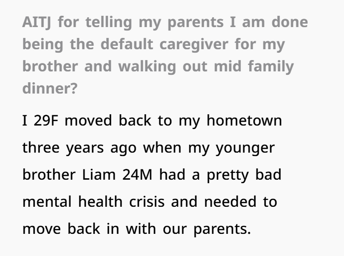 You’re 29, female, and for the last three years you’ve essentially carried the weight of being your younger brother’s full‑time caregiver — driving him to dr’s appointments, dealing with pharmacy/phobia crises, acting as defacto mental‑health support, tech help, emotional caretaker, you name it. What started as a temporary “help for a little while” slowly morphed into a full-blown lifestyle: your life existed around his needs, at the expense of your own.