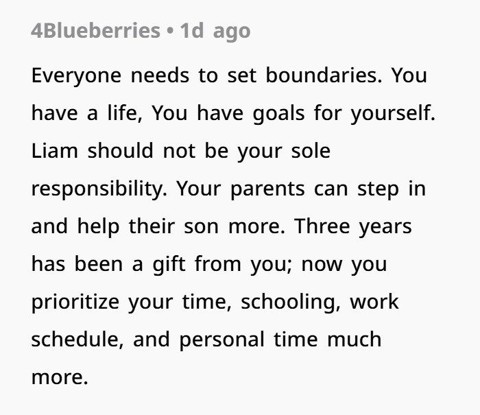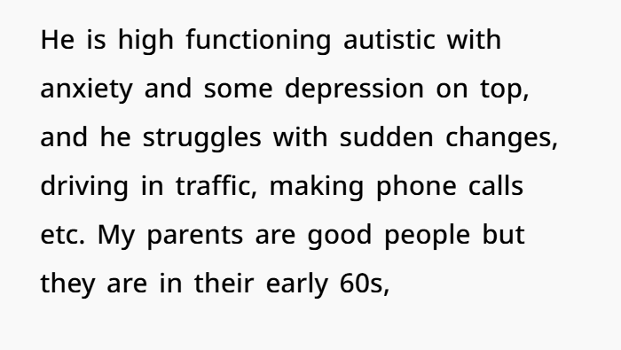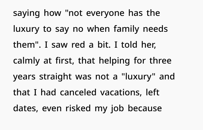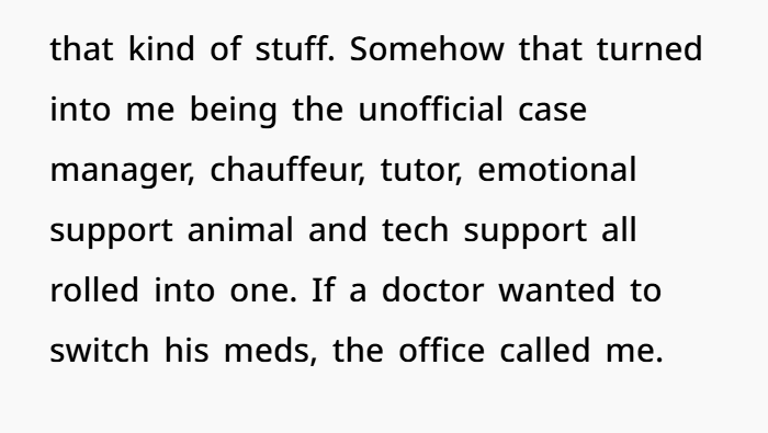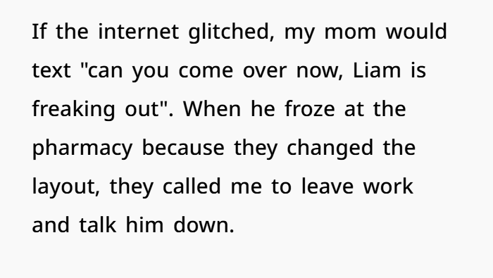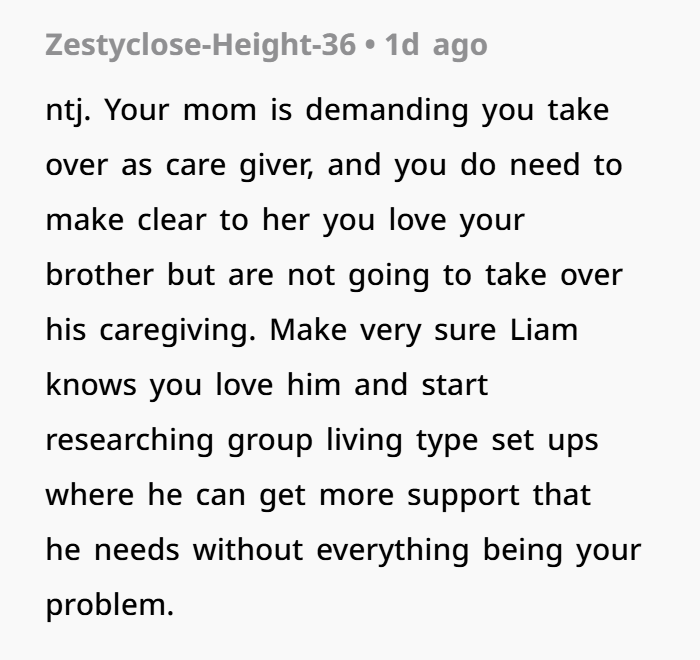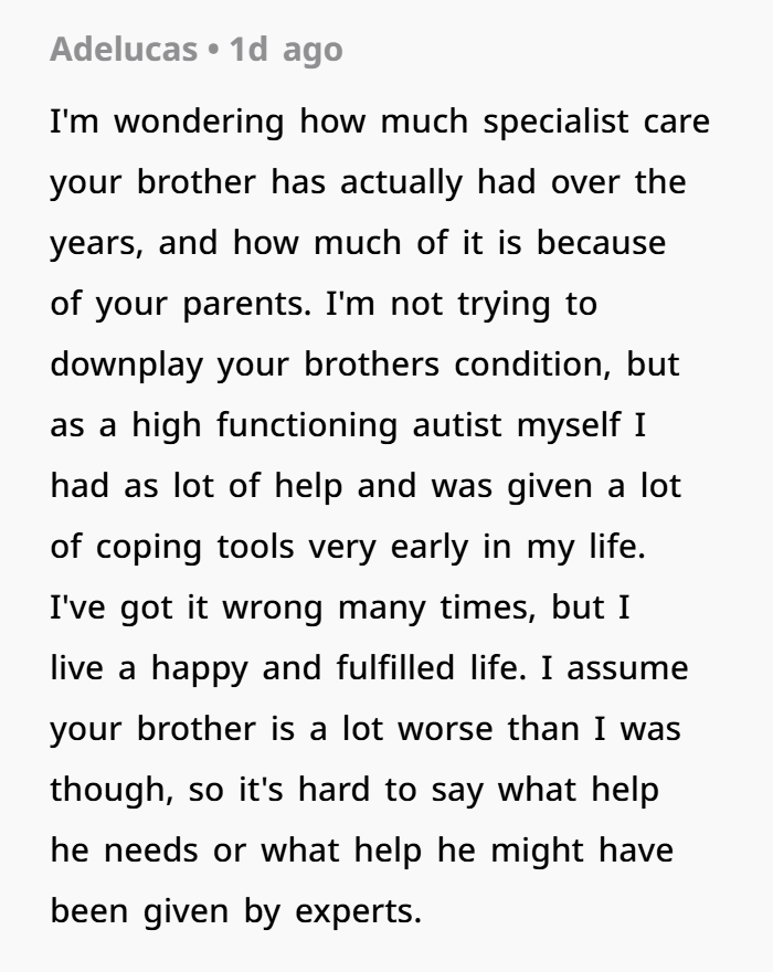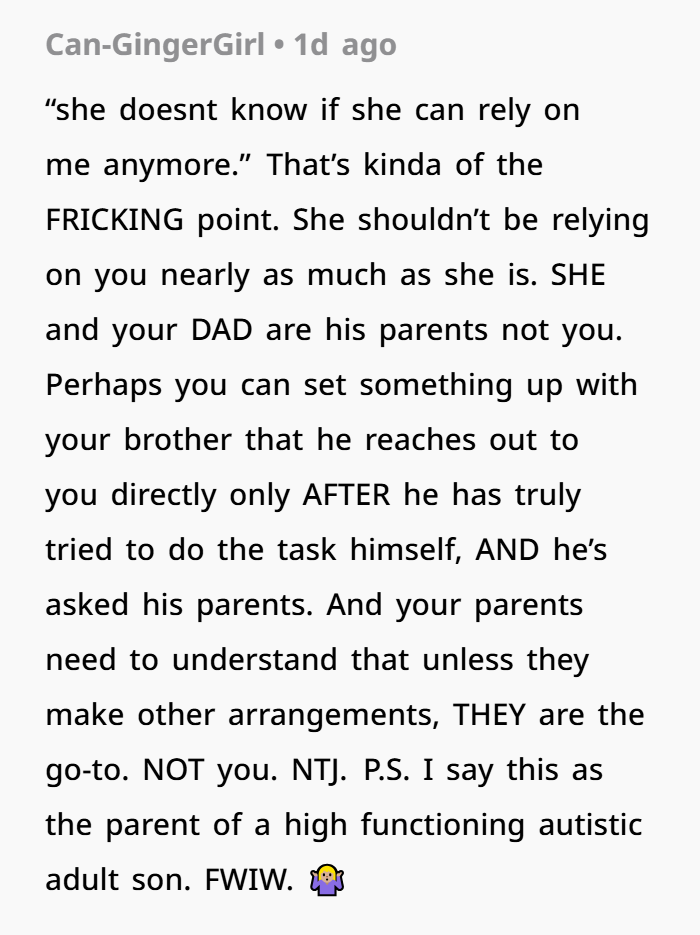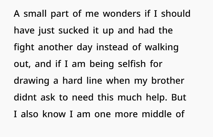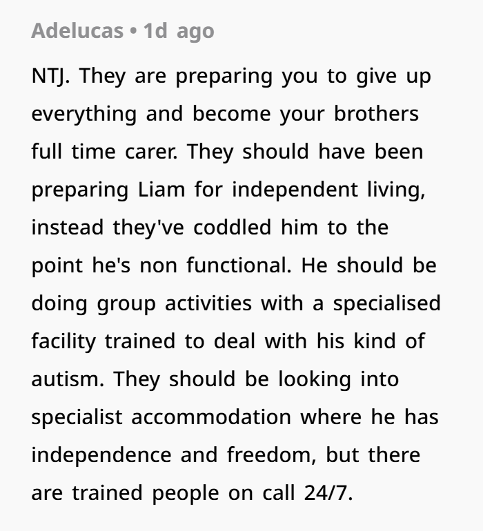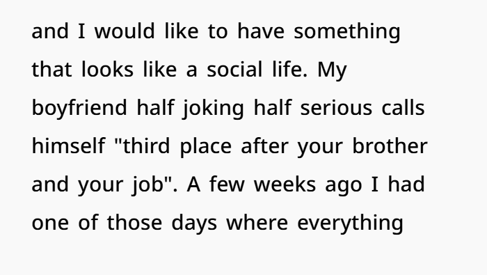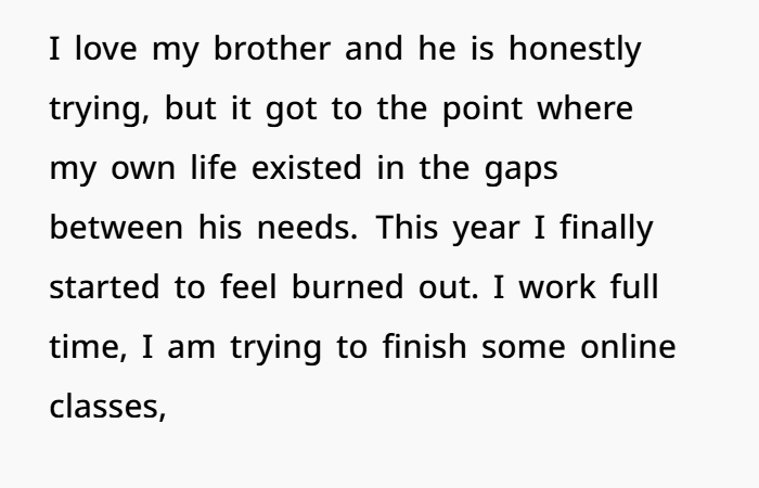 You loved him, and cared about your family, so you gave. But gradually you reached a breaking point: exhaustion, resentment, identity loss. You work full-time, are trying to finish school, want a social life, maybe build a partnership — but your brother’s needs swallowed all free space. Plus, your parents and aunt consistently treated your help as a given, rather than a generous sacrifice.