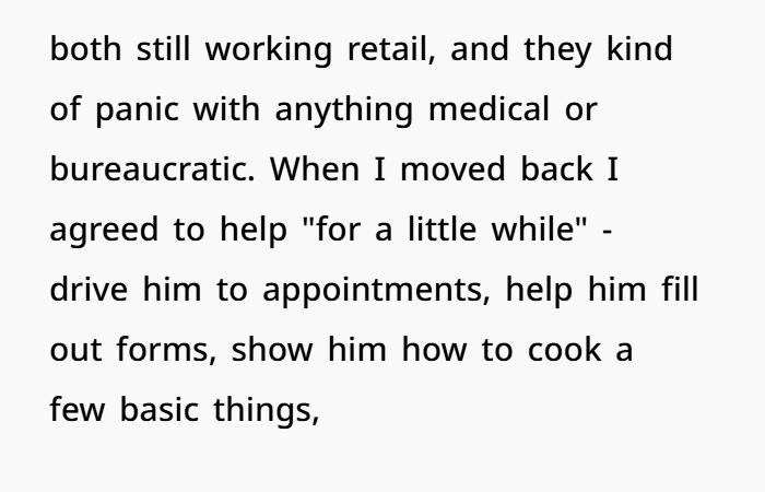 - Maybe propose a family meeting: sit down (without dinner distraction), lay out what’s realistic — you can help sometimes, but not as sole caregiver. Suggest splitting tasks among parents, siblings, other relatives — or even looking into external support.