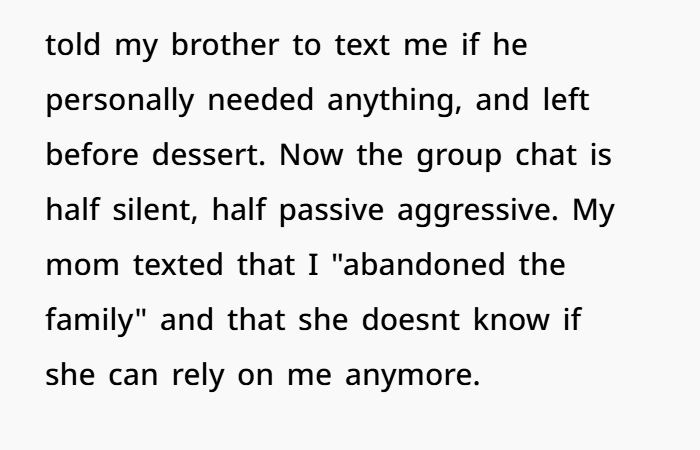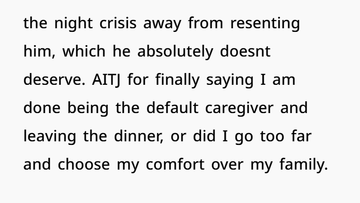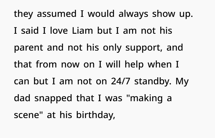 So at your dad’s birthday dinner — with your patience run dry, and after your mom’s jabs and your family’s passive‑aggressive vibe — you told them you were done being the default caregiver. You left. You said you’d still help when you can, but you refuse to be “on call 24/7.” Now there’s tension, guilt-trips, family pressure. And you wonder: Were you out of line? Selfish? A jerk?