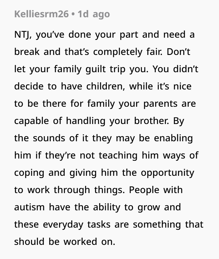 - You’re not your brother’s parent or sole support; you’re his sibling. That doesn’t obligate you to drop your entire life for his needs.