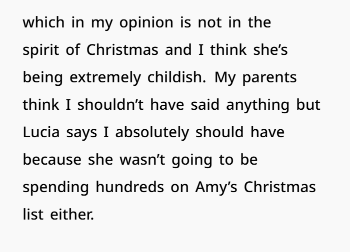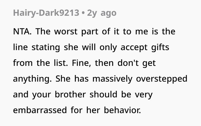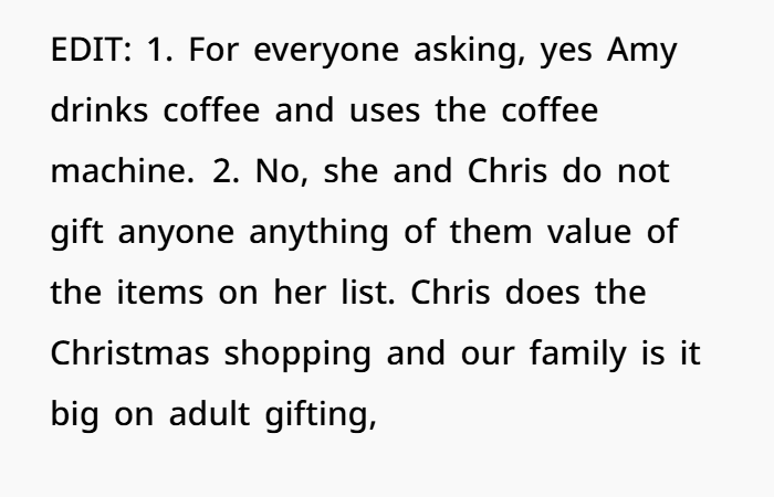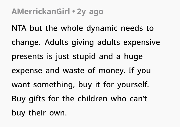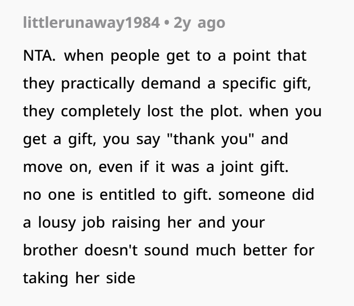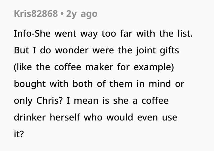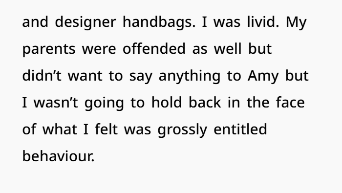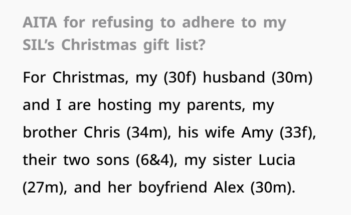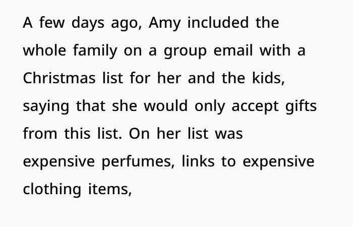 Naturally, this didn’t go over smoothly. Amy’s husband (the OP’s brother, Chris) lashed out, calling the list an attempt to “make things easier.” But was it really? Or was it just entitlement dressed in designer labels? The family remains divided, and the OP is left wondering—did she go too far, or was she simply the first person brave enough to call it like it is?