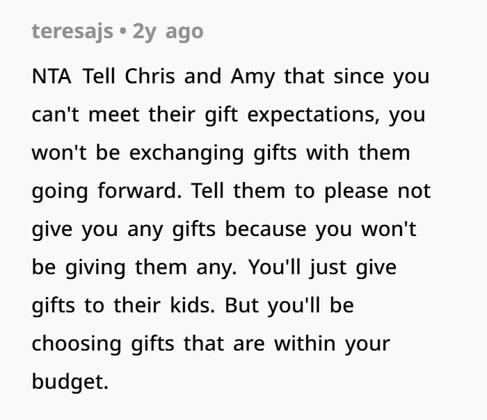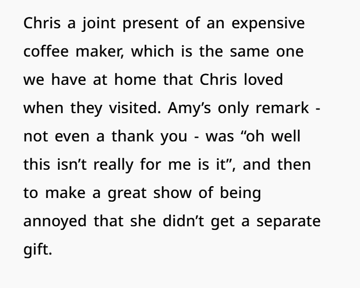A big red flag in this story? Amy doesn’t give gifts of equal value to what she expects. Chris apparently does all the shopping, and their gifts are not in the same price range as the ones on her list. That’s a major no-no in the unspoken rules of family gifting.
