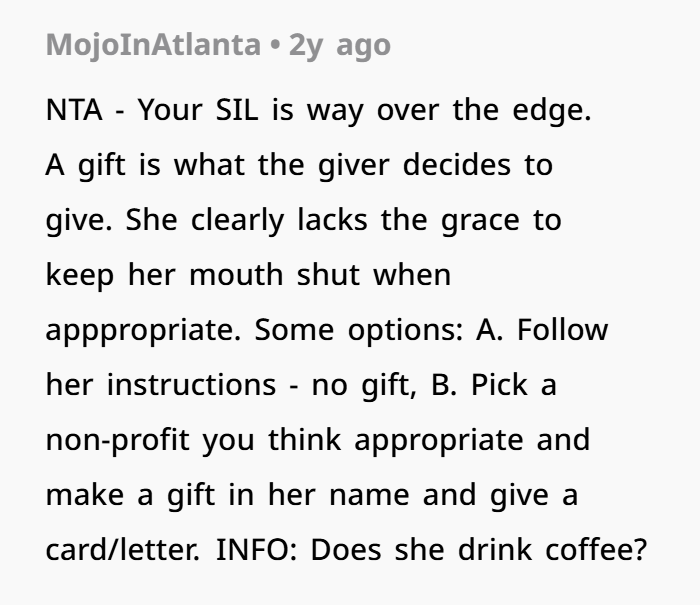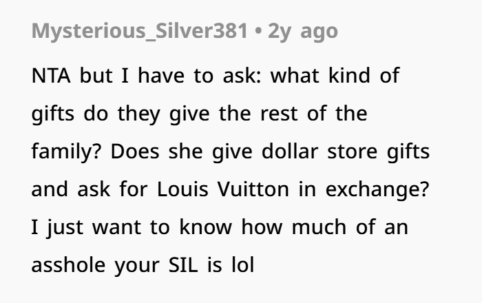 Now, Amy has a track record of being hard to please. The previous year, she made it crystal clear that a joint gift (a high-end coffee machine, no less) didn’t meet her standards. No “thank you.” Just passive-aggressive comments about how it wasn’t for her. This year’s stunt? It felt like the final straw. So, the OP clapped back. She told Amy point-blank that she wouldn’t be purchasing anything on that list and even cheekily offered to connect her with a Louis Vuitton sales associate if she was that eager.