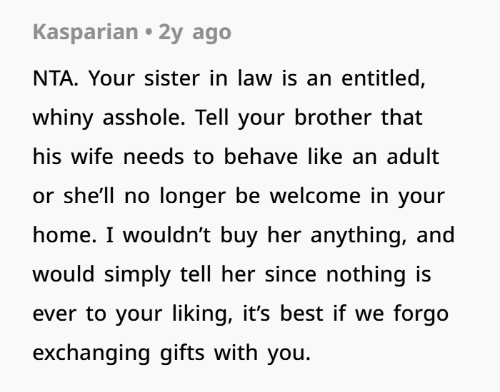 The poster explained that her sister-in-law, Amy, always complained about the gifts she was given and even made faces when she got things she didn’t like