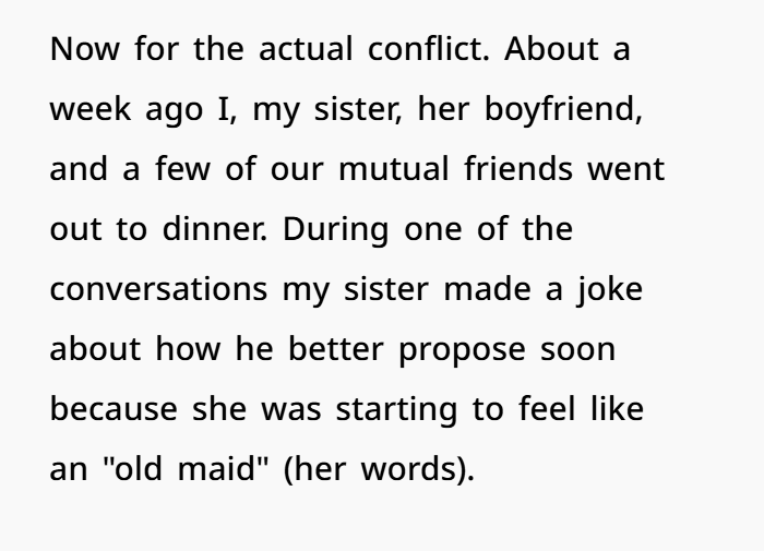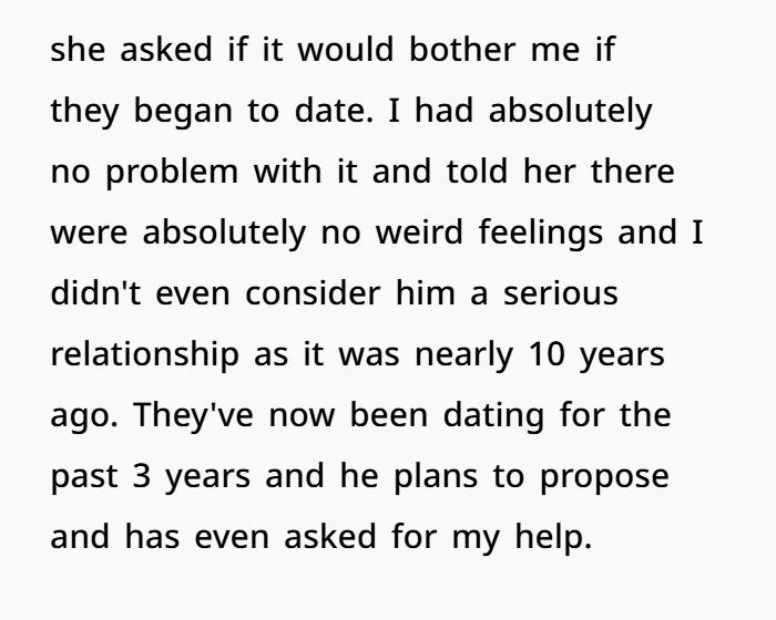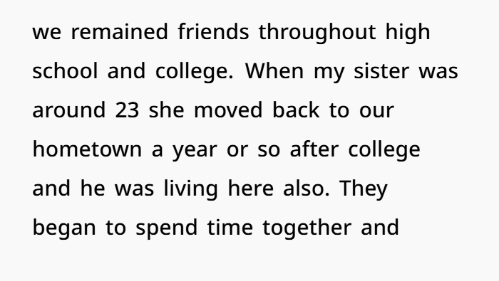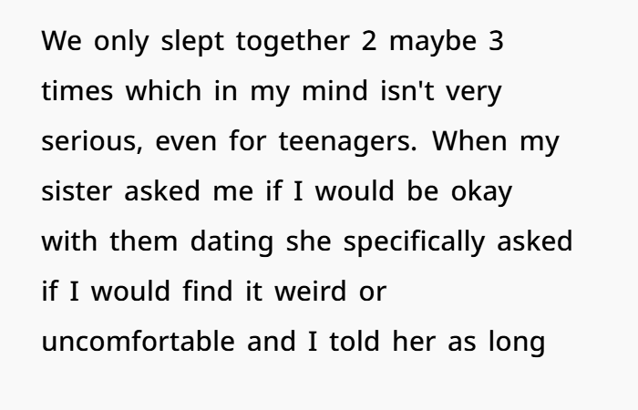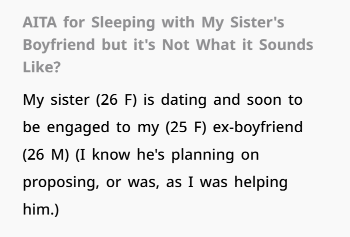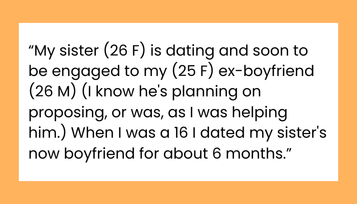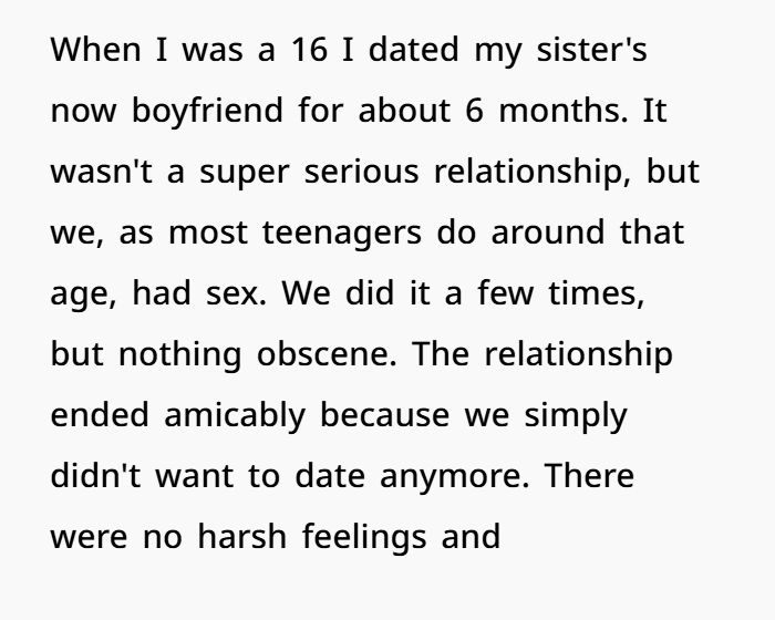 This story dives into a complex family drama centered on trust, awkward history, and long-buried truths. The OP (original poster), a woman in her mid-20s, dated a guy briefly in high school and had sex with him a few times during their teenage relationship. Nearly a decade later, that same guy is now her sister’s boyfriend and—until recently—was planning to propose. When the relationship began, the sister had asked if OP would be uncomfortable with them dating. OP, assuming her sister knew the full past, gave her blessing.