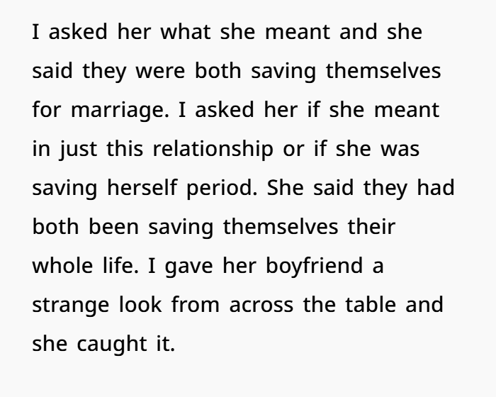 A huge part of the emotional charge in this story comes from purity culture—the belief that “waiting for marriage” equals moral superiority and relationship worth. That’s why the sister was so emotionally attached to the idea that her boyfriend was also a virgin. In her mind, they were spiritually bonded by abstinence.