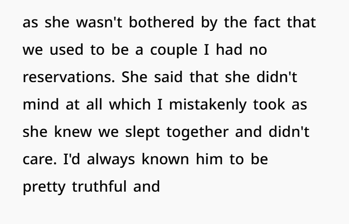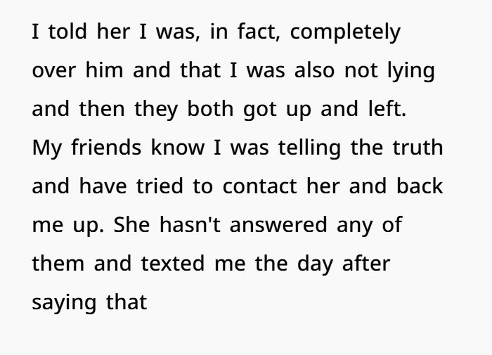 You didn’t dredge up the past for drama. You answered honestly when asked, and you didn’t press the issue until her now-ex tried to call you a liar. You held your ground, took the hits, and the truth backed you up in the end.