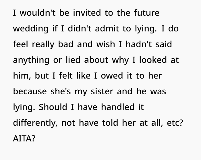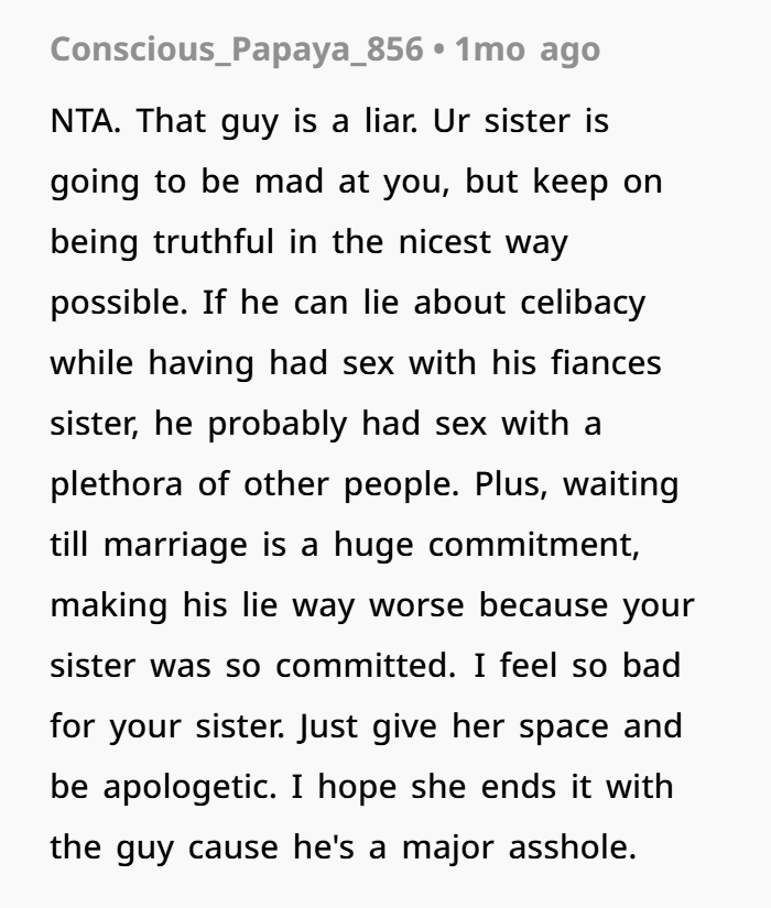 There’s a time for tact and a time for truth. In this case, the truth saved her sister from a future built on lies. She could have said nothing. But then her sister would’ve married a serial cheater under the delusion that they shared a sacred vow.