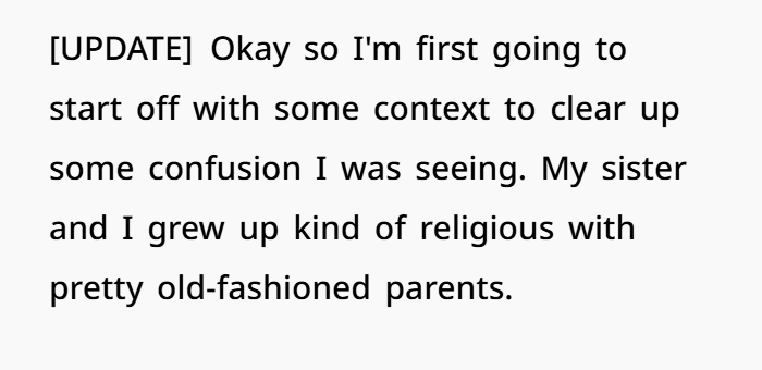 But in a recent update, everything flipped. After days of silent tension, the sister dug into her fiancé’s phone and found out he had been cheating and lying for most of their relationship. Not only was he not a virgin, he had repeatedly betrayed her. She ended the engagement, visited OP to apologize, and they reconciled—both stronger for it.