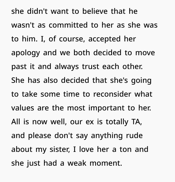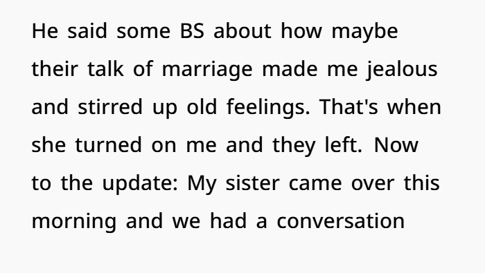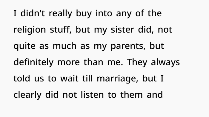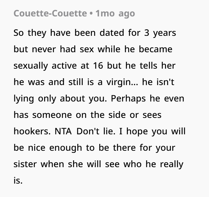 Fast forward to a recent dinner, the sister joked that she and her boyfriend were saving themselves for marriage. When OP realized her sister believed him to be a virgin, she was visibly thrown. Pressed to explain her reaction, she admitted they’d slept together in high school. That triggered a dramatic fallout: the boyfriend denied it, claimed OP was jealous, and the sister sided with him, accusing her sister of sabotage and cutting contact.