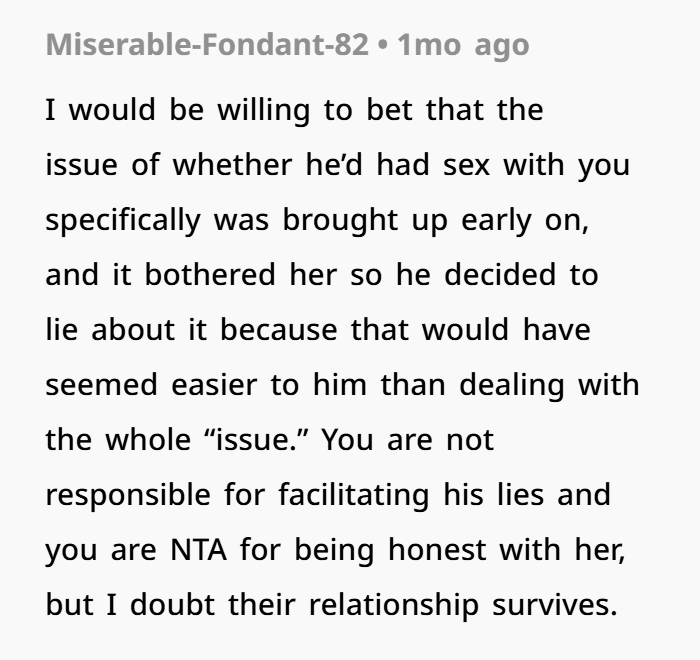 The real issue was his lie, maintained for years, that he was “saving himself.” He let OP take the fall to preserve his fake virtue. He let her be cast as jealous, unstable, and desperate. That’s not just cowardice—that’s emotional abuse.