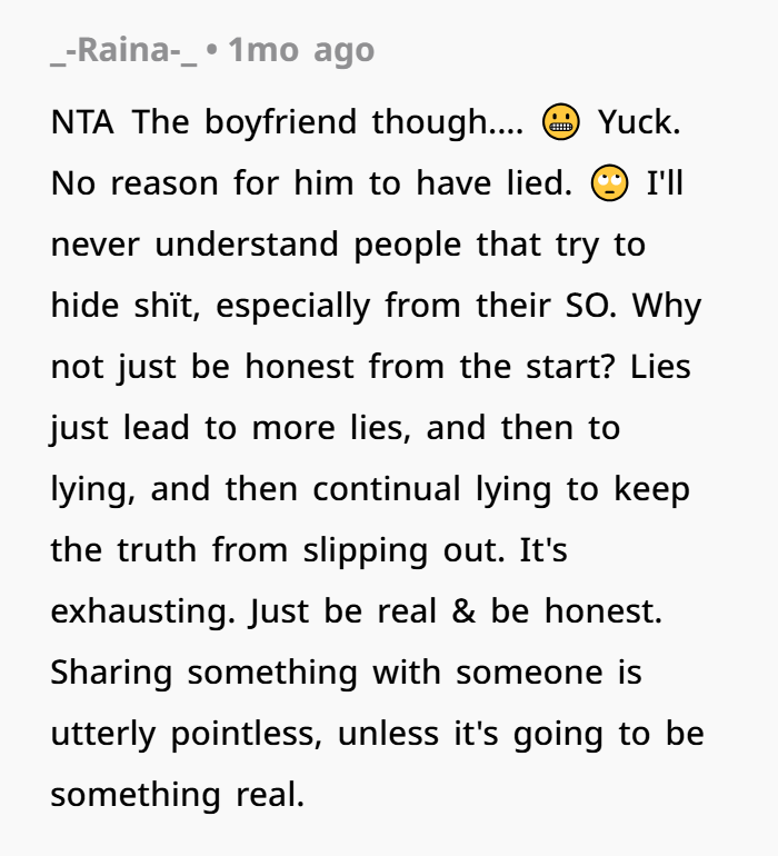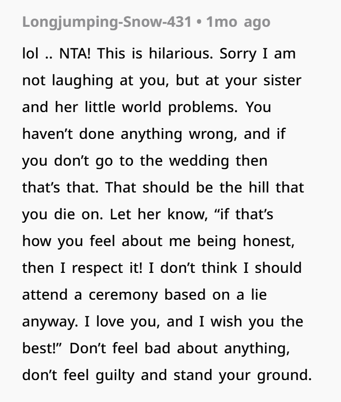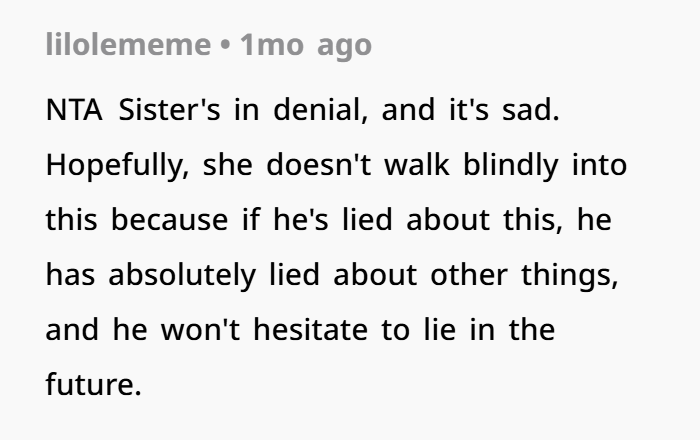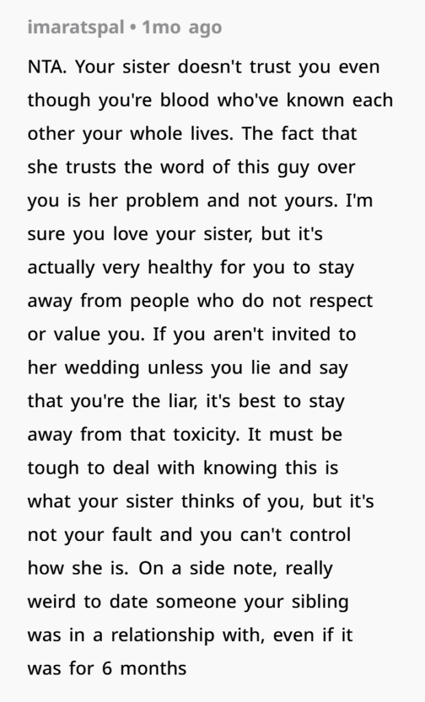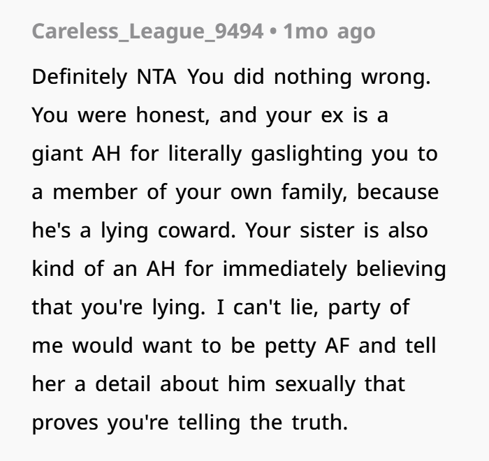 This is one of those stories that stings in every direction. On one hand, the OP made the right choice: being truthful, even when it risked awkwardness. On the other hand, she paid the price for it—being cut out of her sister’s life, called a liar, and accused of jealousy over a relationship she’d left behind long ago.