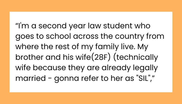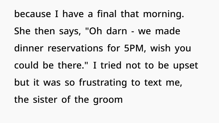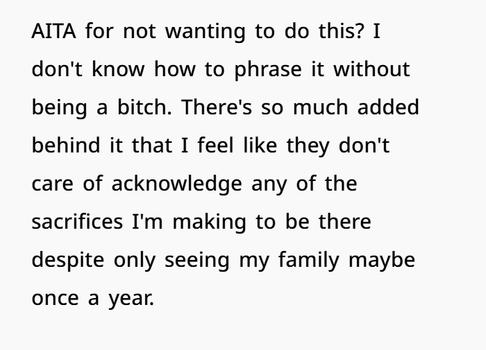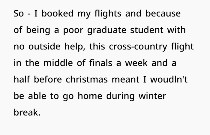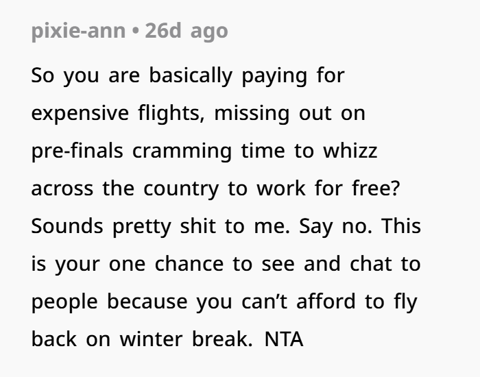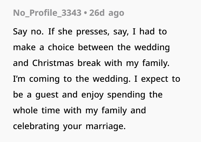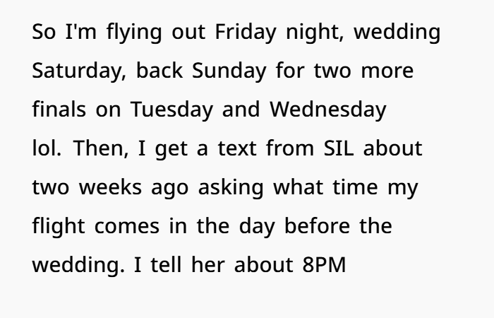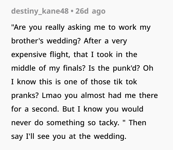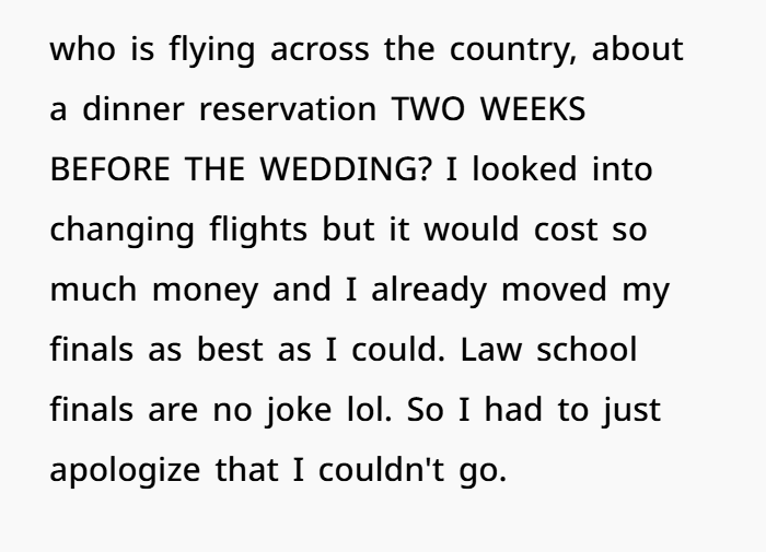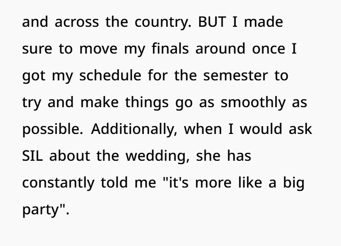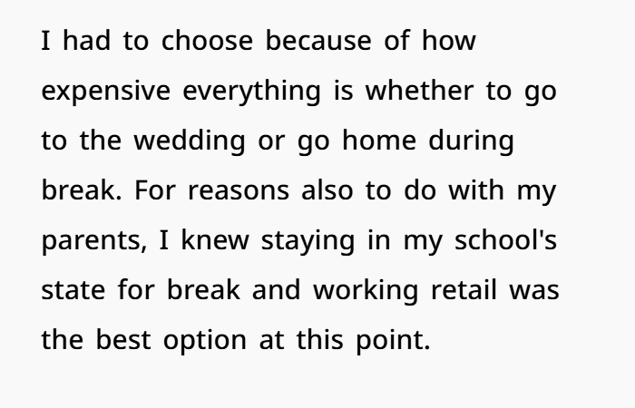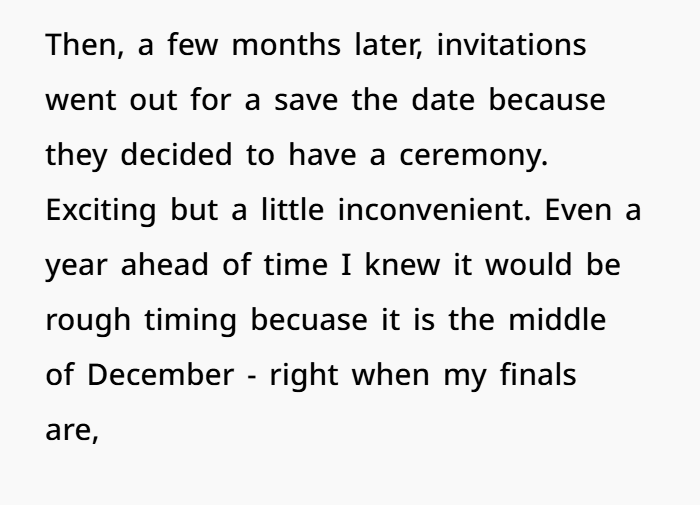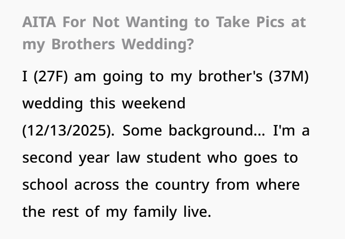 This post highlights the emotional (and logistical) overload of wedding season—especially when boundaries blur between guest and unpaid staff. The OP, a 27-year-old law student, explains how she’s making serious sacrifices to attend her brother’s wedding on December 13th. Not only is it across the country, but it’s also right in the middle of her finals. She juggled exams, rearranged her schedule, and spent hard-earned money just to be there.