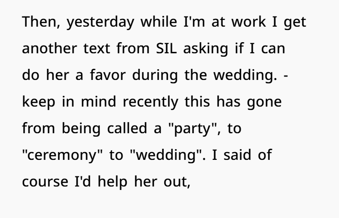 What’s really frustrating here is the casual way your SIL sprang it on you. No heads-up. No acknowledgment of your time. No consideration for your stress levels, finances, or desire to simply enjoy your brother’s wedding.