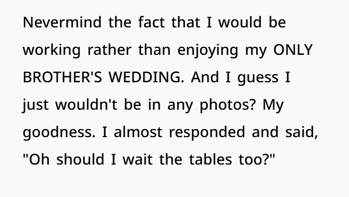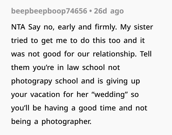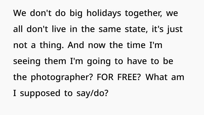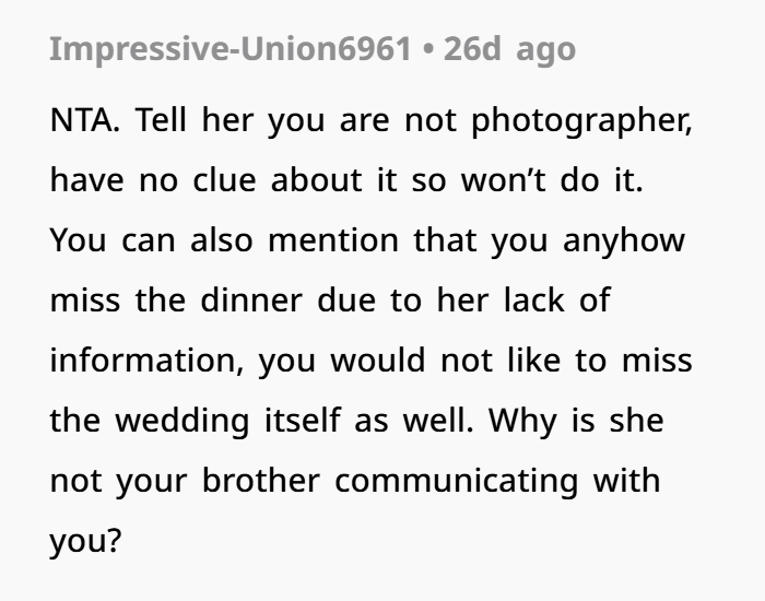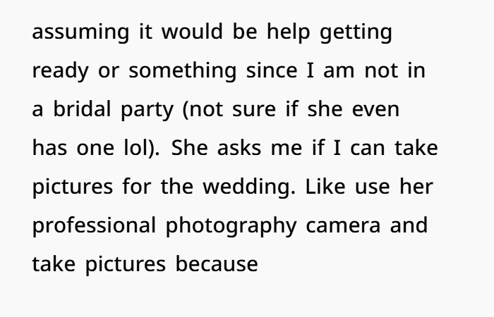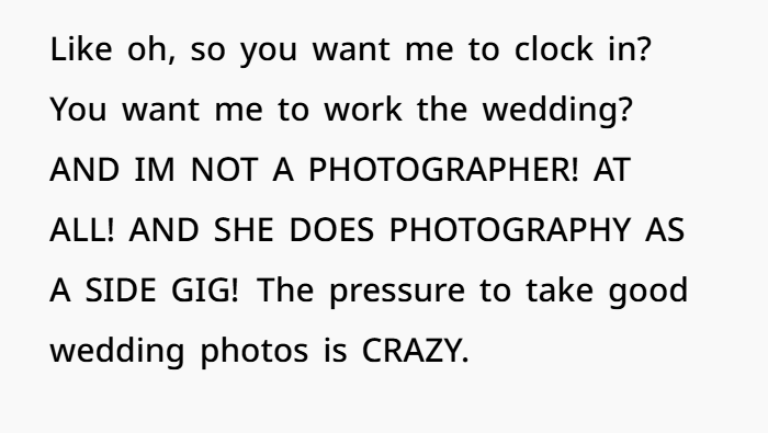 First came the passive-aggressive “oh well” text about a missed rehearsal dinner—scheduled without consulting OP. Then came the real kicker: the bride asked OP to photograph the entire wedding using her professional-grade camera… despite OP being a law student with zero photography experience. From getting-ready shots to portraits, ceremony to reception—the whole nine yards, unpaid, at the only family event OP would get to attend all year.