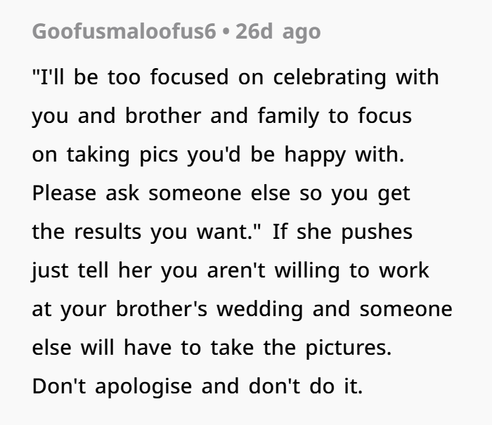 “Hey [SIL], I love that you trust me enough to ask, but I have to be honest—I really don’t feel comfortable taking on that kind of responsibility at the wedding. I’m not a photographer, and I’d hate to mess anything up. I’m also juggling finals and flying across the country, so I’d really just like to be there as a guest and celebrate with you guys. I hope you understand!”