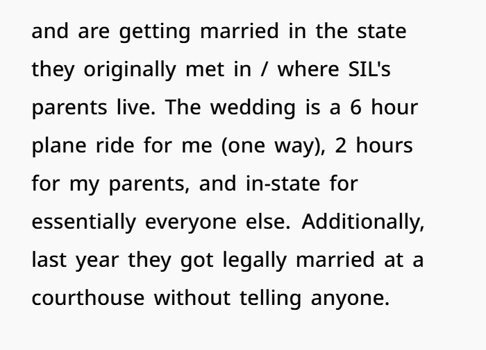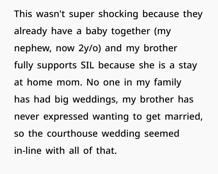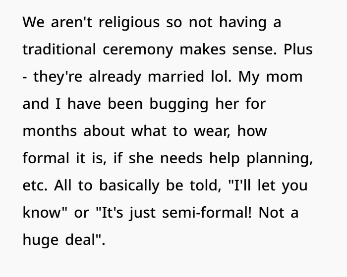 Her brother and sister-in-law (SIL) already had a courthouse wedding the previous year, so this upcoming celebration was framed as more of a “casual party” than a traditional event. OP tried for months to get clear info about dress codes or expectations—only to be told, “don’t worry, it’s chill.” But just weeks before the event, things escalated.