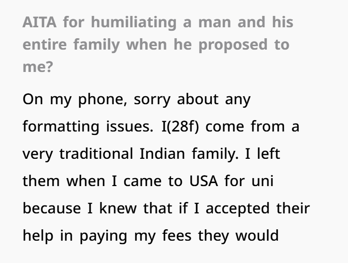 In this intense AITA story, a 28‑year‑old woman from a traditional Indian family shares how a surprise “welcome home party” turned into a forced proposal event. She’d moved to the USA for college, cut financial ties with her family to keep independence, and clearly said she wasn’t interested in marriage. But during a visit, her parents sprung a party, introduced her to a man, and he proposed — all without her consent. Shocked and angry, she exploded with harsh words, calling everyone involved misogynistic and disgusting before leaving.