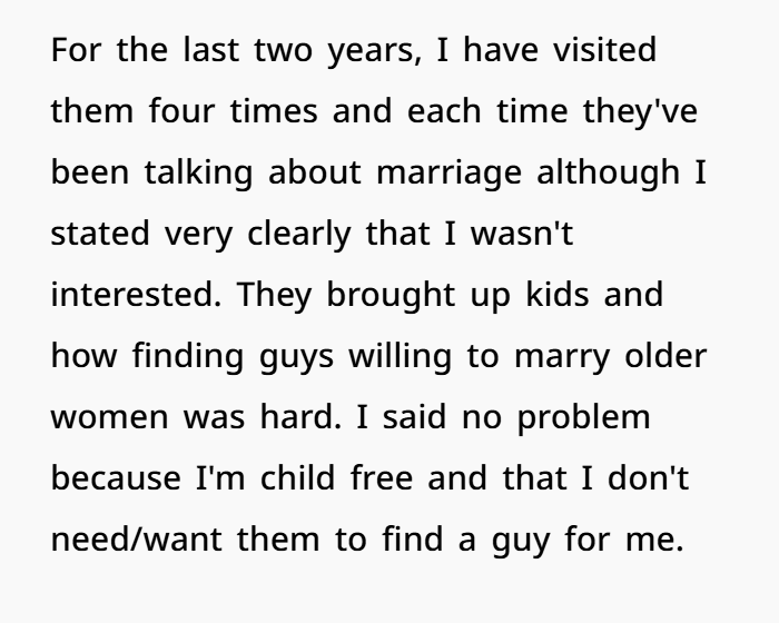 The OP’s parents didn’t ask her if she was comfortable meeting someone with the intention of marriage. They assumed she’d conform. That’s a huge violation of her personal boundaries.