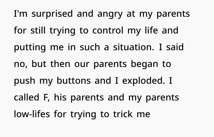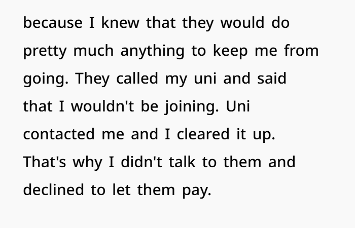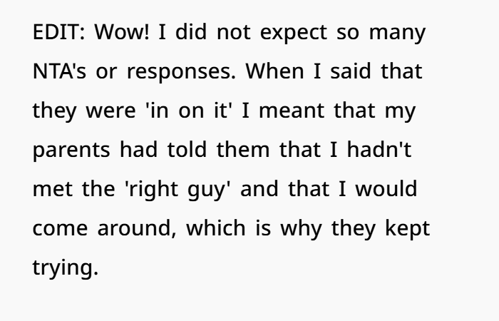 It’s important to note something else: OP has a history of being pushed against her will. When she wanted to go to college, her parents tried to stop her. They even contacted her university claiming she wouldn’t attend. She had to fight just to get there.