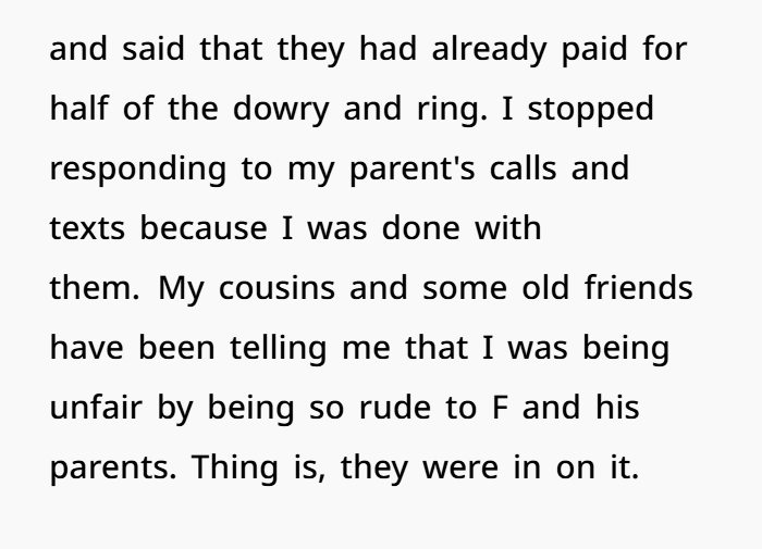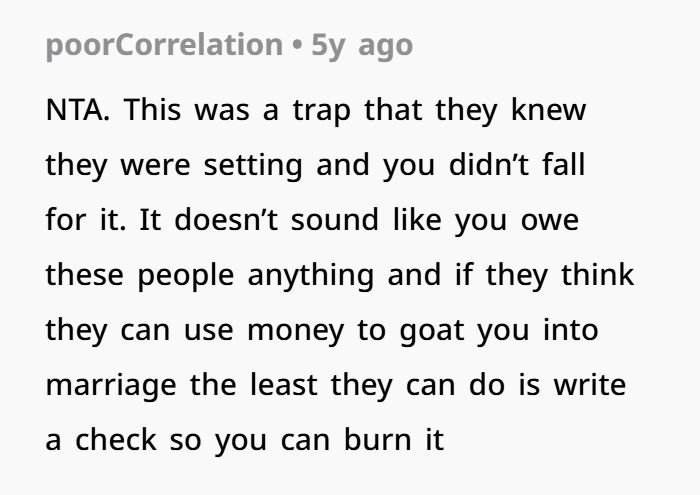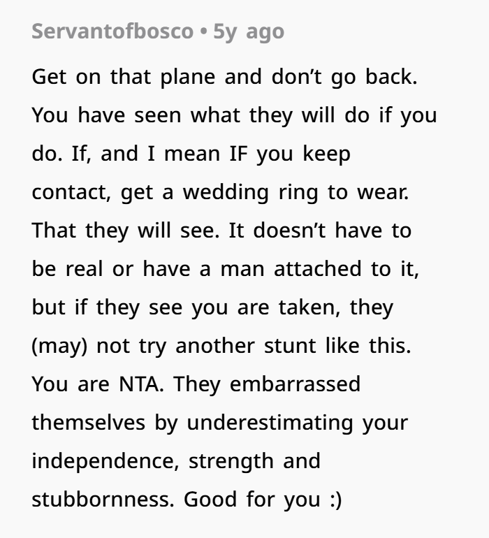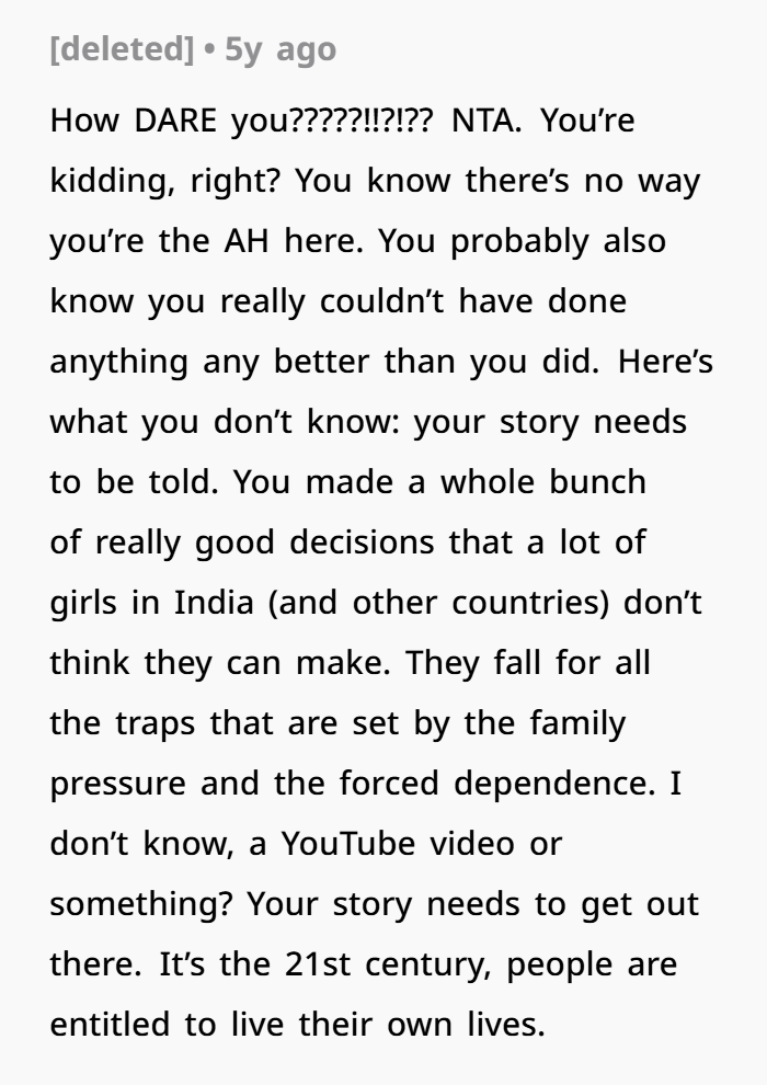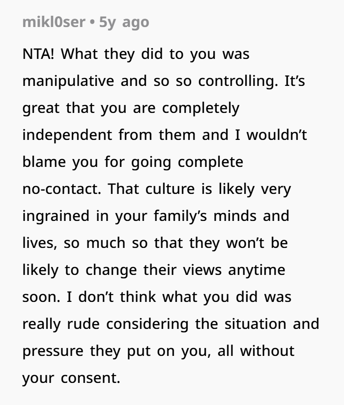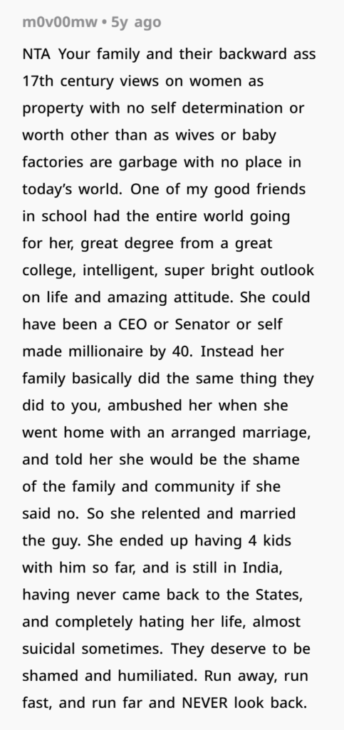 But here’s a twist — the shame shouldn’t be on the OP. The shame is on the adults who decided it was acceptable to trap someone into a life decision she clearly didn’t want. They expected her to just comply — to give up her autonomy, money, career, and move to India. That’s a huge life jump. It’s not a small thing like choosing dinner.