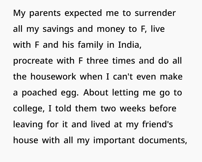One of the big themes in this story is the clash between traditional Indian culture and modern Western independence. In many Indian families, arranged marriages or introductions are normal. But the OP made it clear years ago that she didn’t want that life. She chose to leave her family to study in the US, pay her own way, and build a life that didn’t involve dependency on her parents.