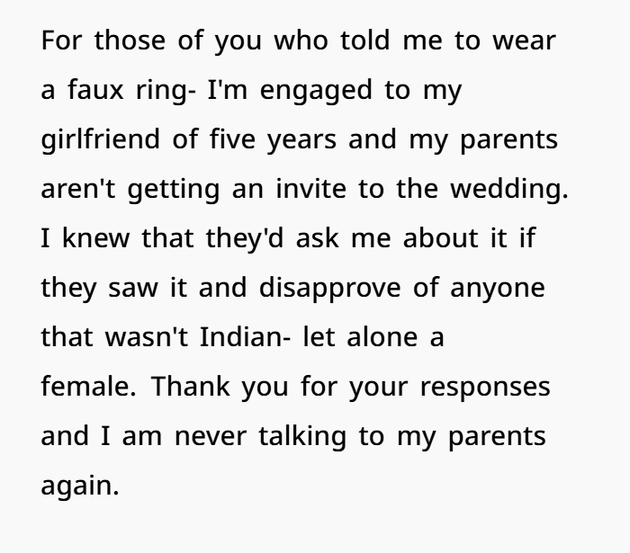 OP made a decision to stop responding to her parents and reject their calls. She revealed she’s engaged to her girlfriend of five years and won’t let her family attend the wedding.