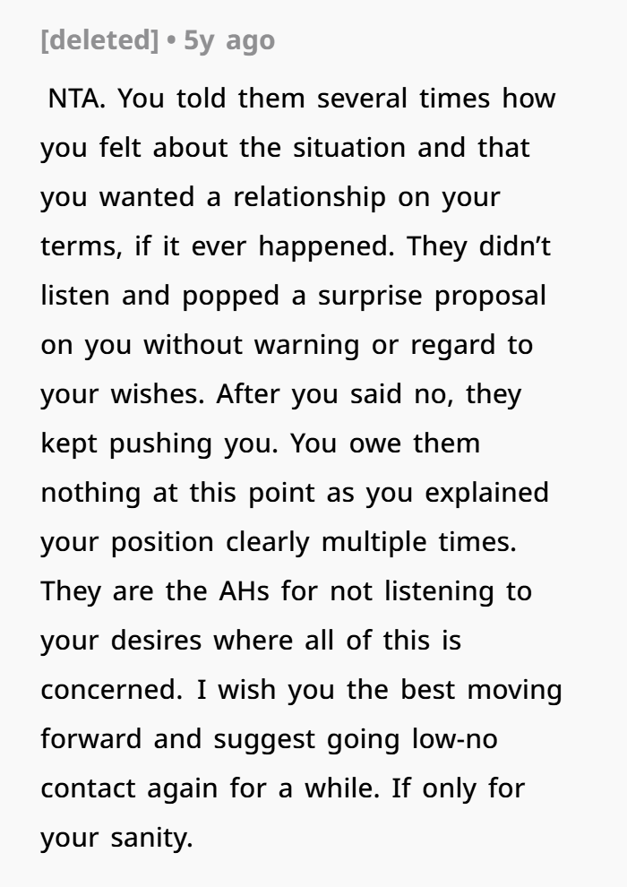 Here’s an important piece: a proposal should never be a surprise in the sense of not knowing the person at all. Surprise proposals are romantic in movies because the couple usually already has a mutual understanding about their relationship and marriage. But proposing someone you barely know — especially someone who has repeatedly expressed she doesn’t want marriage — that’s not romantic. That’s coercive.