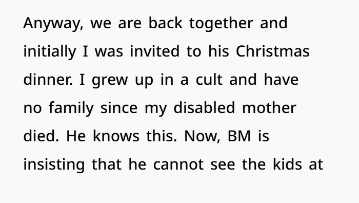 Your story carries a lot of pain, courage, and survival layered into it. You’ve come out of a cult, endured emotional abuse, survived dangerous relationships, and are still learning how to trust yourself and recognize when something isn’t love — it’s control, obligation, or emotional neglect. You’ve been rebuilding your self‑worth piece by piece, and now you’re with a man who not only fails to protect you from hostility, but also expects you to finance his holidays, do emotional labor, and then disappear so everyone else can enjoy the benefits of your effort while you sit alone on Christmas.