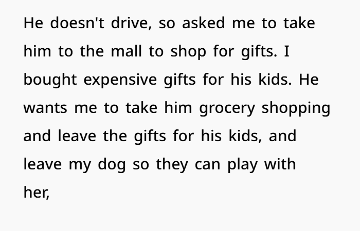 Let’s be honest: asking you to leave the gifts, drive him shopping, and drop off your dog while you sit alone on Christmas is not only inconsiderate — it borders on emotional exploitation and financial dependency behavior.