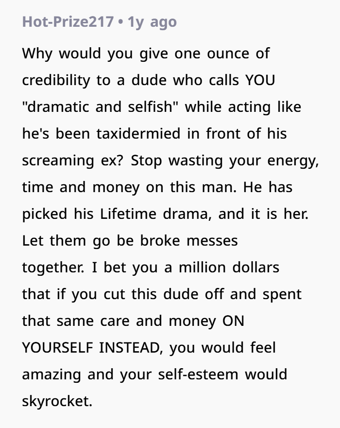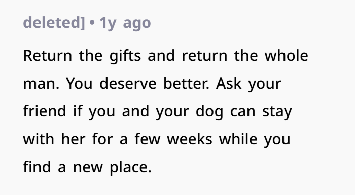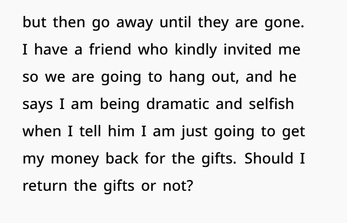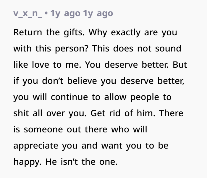 That’s not love. That’s not partnership. That’s someone using your kindness and history of self‑doubt against you. He uninvited you to Christmas because his ex demanded it — and instead of standing up for you or setting boundaries, he asked you to drive him, buy gifts, provide your dog for entertainment, and then vanish. And when you rightfully said you were returning the gifts, he called you dramatic and selfish. That’s manipulation, not misunderstanding.