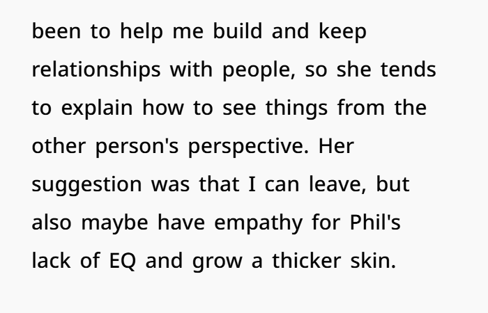 And your therapist’s approach — encouraging you to absorb discomfort and empathize with others while minimizing your own feelings — may unintentionally reinforce that old narrative that you should endure mistreatment for the sake of “keeping relationships.” Trauma‑informed therapy should help you develop self‑advocacy, secure attachment, and healthy boundaries, not teach you to tolerate disrespect in order to appear agreeable.