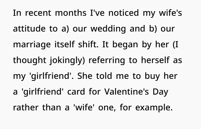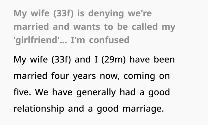 - Your wife may be attempting to redefine the relationship in her mind — perhaps she’s uneasy with what “wife” means (commitment levels, roles, public identity) and is opting for a “girlfriend” label which may feel more flexible.