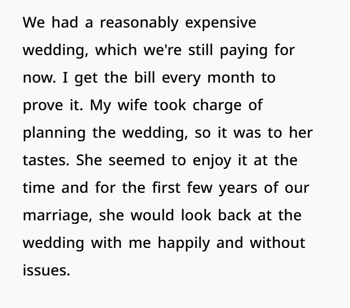 - Four to five years in, payments still ongoing for wedding, maybe financial stress. Maybe she’s comparing her expectations vs reality of married life.