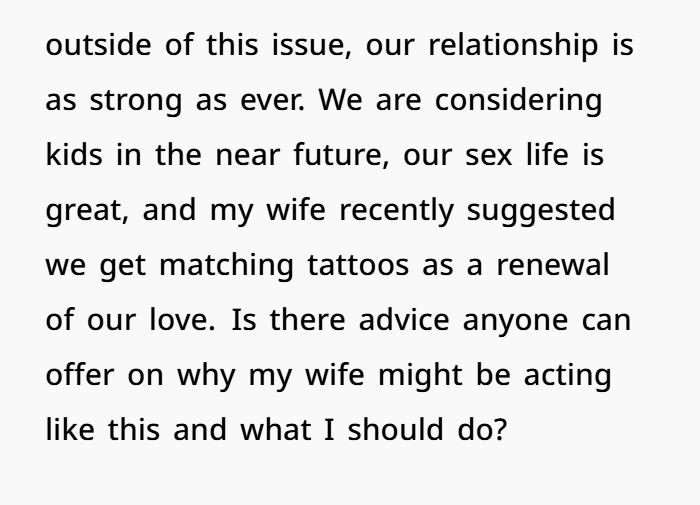 - Perhaps suggest something new that renews your connection (matching tattoos you mentioned) but use this moment not just for fun but for deeper meaning: “What does this tattoo represent for us now?”